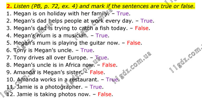 Listen (PB, p. 72, ex. 4) and mark if the sentences are true or false. 1. Megan is on holiday with her family. – True. 2. Megan’s dad helps people at work every day. – True. 3. Megan’s dad is trying to catch a fish today. – False. 4. Megan’s mum is a musician. – True. 5. Megan’s mum is playing the guitar now. – False. 6. Tony is Megan’s uncle. – True. 7. Tony drives all over Europe. – True. 8. Megan’s uncle is in Africa now. – False. 9. Amanda is Megan’s sister. – False. 10. Amanda works in a restaurant. – True. 11. Jamie is a photographer. – True. 12. Jamie is taking photos now. – False.