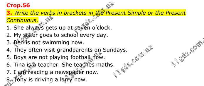 Write the verbs in brackets in the Present Simple or the Present Continuous. 1. She always gets up at seven o’clock. 2. My sister goes to school every day. 3. Ben is not swimming now. 4. They often visit grandparents on Sundays. 5. Boys are not playing football now. 6. Tina is a teacher. She teaches maths. 7. I am reading a newspaper now. 8. Tony is driving a lorry now.