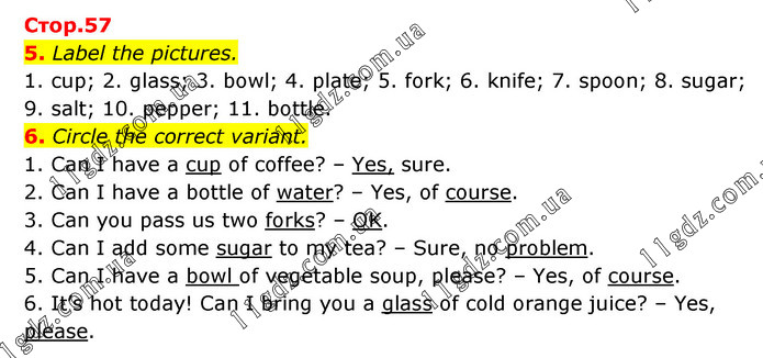 5. Label the pictures. 1. сup; 2. glass; 3. bowl; 4. plate; 5. fork; 6. knife; 7. spoon; 8. sugar; 9. salt; 10. pepper; 11. bottle. 6. Circle the correct variant. 1. Can I have a cup of coffee? – Yes, sure. 2. Can I have a bottle of water? – Yes, of course. 3. Can you pass us two forks? – OK. 4. Can I add some sugar to my tea? – Sure, no problem. 5. Can I have a bowl of vegetable soup, please? – Yes, of course. 6. It’s hot today! Can I bring you a glass of cold orange juice? – Yes, please.
