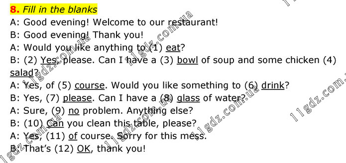 Fill in the blanks A: Good evening! Welcome to our restaurant! B: Good evening! Thank you! A: Would you like anything to (1) eat? B: (2) Yes, please. Can I have a (3) bowl of soup and some chicken (4) salad? A: Yes, of (5) course. Would you like something to (6) drink? B: Yes, (7) please. Can I have a (8) glass of water? A: Sure, (9) no problem. Anything else? B: (10) Can you clean this table, please? A: Yes, (11) of course. Sorry for this mess. B: That’s (12) OK, thank you!