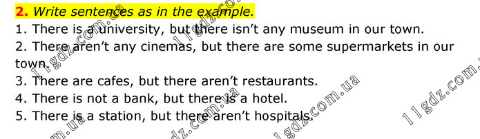 Write sentences as in the example. 1. There is a university, but there isn’t any museum in our town. 2. There aren’t any cinemas, but there are some supermarkets in our town. 3. There are cafes, but there aren’t restaurants. 4. There is not a bank, but there is a hotel. 5. There is a station, but there aren’t hospitals.