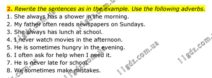 Rewrite the sentences as in the example. Use the following adverbs. 1. She always has a shower in the morning. 2. My father often reads newspapers on Sundays. 3. She always has lunch at school. 4. I never watch movies in the afternoon. 5. He is sometimes hungry in the evening. 6. I often ask for help when I need it. 7. He is never late for school. 8. We sometimes make mistakes.