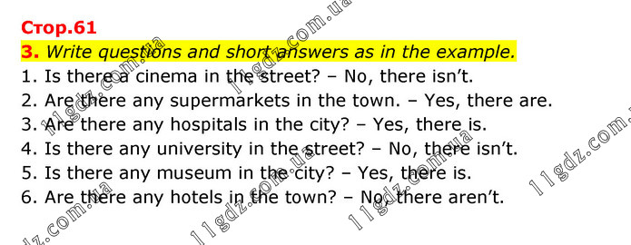 3. Write questions and short answers as in the example. 1. Is there a cinema in the street? – No, there isn’t. 2. Are there any supermarkets in the town. – Yes, there are. 3. Are there any hospitals in the city? – Yes, there is. 4. Is there any university in the street? – No, there isn’t. 5. Is there any museum in the city? – Yes, there is. 6. Are there any hotels in the town? – No, there aren’t.