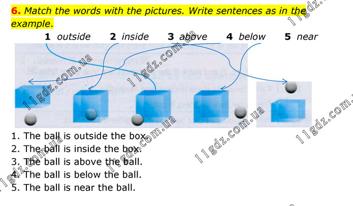1. The ball is outside the box. 2. The ball is inside the box. 3. The ball is above the ball. 4. The ball is below the ball. 5. The ball is near the ball.