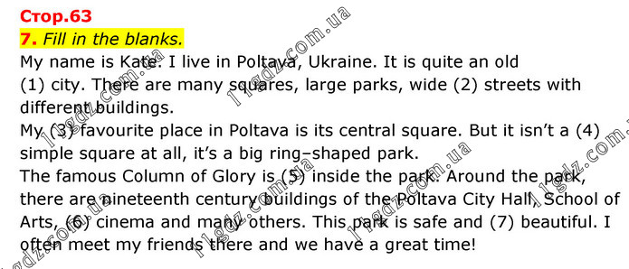Fill in the blanks. My name is Kate. I live in Poltava, Ukraine. It is quite an old (1) city. There are many squares, large parks, wide (2) streets with different buildings. My (3) favourite place in Poltava is its central square. But it isn’t a (4) simple square at all, it’s a big ring–shaped park. The famous Column of Glory is (5) inside the park. Around the park, there are nineteenth century buildings of the Poltava City Hall, School of Arts, (6) cinema and many others. This park is safe and (7) beautiful. I often meet my friends there and we have a great time!