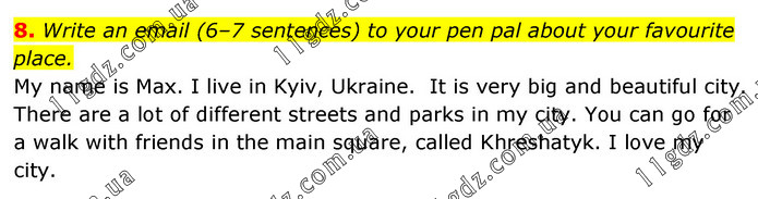 Write an email (6–7 sentences) to your pen pal about your favourite place. My name is Max. I live in Kyiv, Ukraine. It is very big and beautiful city. There are a lot of different streets and parks in my city. You can go for a walk with friends in the main square, called Khreshatyk. I love my city.