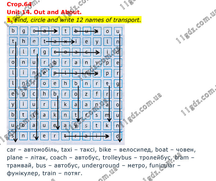 Unit 14. Out and About. 1. Find, circle and write 12 names of transport. car – автомобіль, taxi – таксі, bike – велосипед, boat – човен, plane – літак, coach – автобус, trolleybus – тролейбус, tram – трамвай, bus – автобус, underground – метро, funicular – фунікулер, train – потяг.