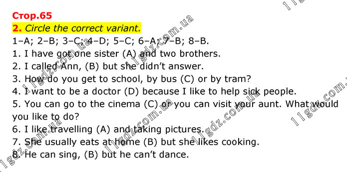 2. Circle the correct variant. 1–A; 2–B; 3–C; 4–D; 5–C; 6–A; 7–B; 8–B. 1. I have got one sister (A) and two brothers. 2. I called Ann, (B) but she didn’t answer. 3. How do you get to school, by bus (C) or by tram? 4. I want to be a doctor (D) because I like to help sick people. 5. You can go to the cinema (C) or you can visit your aunt. What would you like to do? 6. I like travelling (A) and taking pictures. 7. She usually eats at home (B) but she likes cooking. 8. He can sing, (B) but he can’t dance.