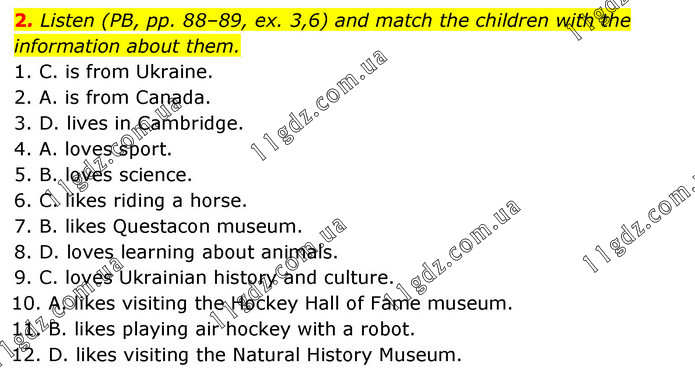 Listen (PB, pp. 88–89, ex. 3,6) and match the children with the information about them. 1. C. is from Ukraine. 2. A. is from Canada. 3. D. lives in Cambridge. 4. A. loves sport. 5. B. loves science. 6. C. likes riding a horse. 7. B. likes Questacon museum. 8. D. loves learning about animals. 9. C. loves Ukrainian history and culture. 10. A. likes visiting the Hockey Hall of Fame museum. 11. B. likes playing air hockey with a robot. 12. D. likes visiting the Natural History Museum.