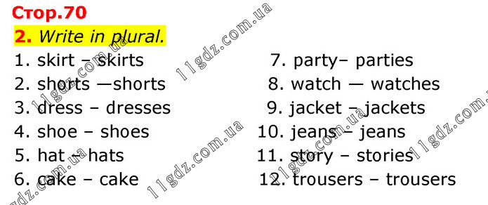 Write in plural. 1. skirt – skirts 7. party– parties 2. shorts —shorts 8. watch — watches 3. dress – dresses 9. jacket – jackets 4. shoe – shoes 10. jeans – jeans 5. hat – hats 11. story – stories 6. cake – cake 12. trousers – trousers