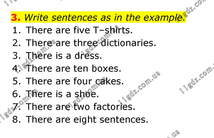 Write sentences as in the example. 1. There are five T–shirts. 2. There are three dictionaries. 3. There is a dress. 4. There are ten boxes. 5. There are four cakes. 6. There is a shoe. 7. There are two factories. 8. There are eight sentences.