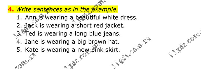 Write sentences as in the example. 1. Ann is wearing a beautiful white dress. 2. Jack is wearing a short red jacket. 3. Ted is wearing a long blue jeans. 4. Jane is wearing a big brown hat. 5. Kate is wearing a new pink skirt.