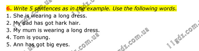 Write 5 sentences as in the example. Use the following words. 1. She is wearing a long dress. 2. My dad has got hark hair. 3. My mum is wearing a long dress. 4. Tom is young. 5. Ann has got big eyes.