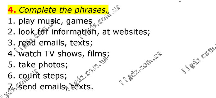 Complete the phrases. 1. play music, games 2. look for information, at websites; 3. read emails, texts; 4. watch TV shows, films; 5. take photos; 6. count steps; 7. send emails, texts.
