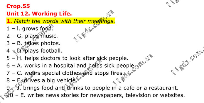 Unit 12. Working Life. 1. Match the words with their meanings. 1 – l. grows food. 2 – G. plays music. 3 – B. takes photos. 4 – D. plays football. 5 – H. helps doctors to look after sick people. 6 – A. works in a hospital and helps sick people. 7 – C. wears special clothes and stops fires. 8 – F. drives a big vehicle. 9 – J. brings food and drinks to people in a cafe or a restaurant. 10 – E. writes news stories for newspapers, television or websites.