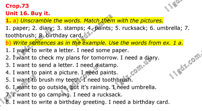 Unit 16. Buy it. 1. a) Unscramble the words. Match them with the pictures. 1. paper; 2. diary; 3. stamps; 4. paints; 5. rucksack; 6. umbrella; 7. toothbrush; 8. birthday card. b) Write sentences as in the example. Use the words from ex. 1 a. 1. I want to write a letter. I need some paper. 2. I want to check my plans for tomorrow. I need a diary. 3. I want to send a letter. I need a stamp. 4. I want to paint a picture. I need paints. 5. I want to brush my teeth. I need toothbrush. 6. I want to go outside, but it’s raining. I need umbrella. 7. I want to go camping. I need a rucksack. 8. I want to write a birthday greeting. I need a birthday card.