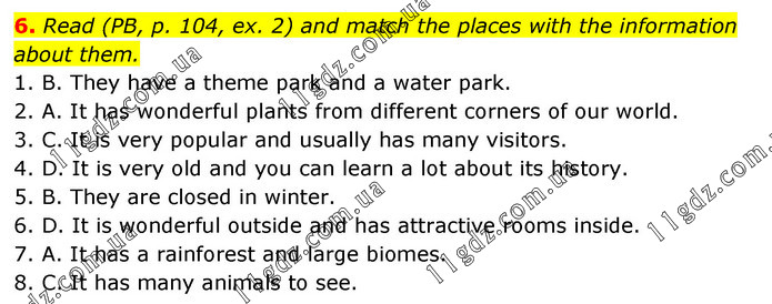 Read (PB, p. 104, ex. 2) and match the places with the information about them. 1. B. They have a theme park and a water park. 2. A. It has wonderful plants from different corners of our world. 3. C. It is very popular and usually has many visitors. 4. D. It is very old and you can learn a lot about its history. 5. B. They are closed in winter. 6. D. It is wonderful outside and has attractive rooms inside. 7. A. It has a rainforest and large biomes. 8. C. It has many animals to see.