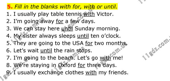 Fill in the blanks with for, with or until. 1. I usually play table tennis with Victor. 2. I’m going away for a few days. 3. We can stay here until Sunday morning. 4. My sister always sleeps until ten o’clock. 5. They are going to the USA for two months. 6. Let’s wait until the rain stops. 7. I’m going to the beach. Let’s go with me! 8. We’re staying in Oxford for three days. 9. I usually exchange clothes with my friends.