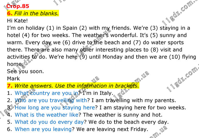 6. Fill in the blanks. Hi Kate! I’m on holiday (1) in Spain (2) with my friends. We’re (3) staying in a hotel (4) for two weeks. The weather’s wonderful. It’s (5) sunny and warm. Every day we (6) drive to the beach and (7) do water sports there. There are also many other interesting places to (8) visit and activities to do. We’re here (9) until Monday and then we are (10) flying home. See you soon. Mark 7. Write answers. Use the information in brackets. 1. What country are you in? I’m in Italy. 2. Who are you travelling with? I am travelling with my parents. 3. How long are you staying here? I am staying here for two weeks. 4. What is the weather like? The weather is sunny and hot. 5. What do you do every day? We do to the beach every day. 6. When are you leaving? We are leaving next Friday.