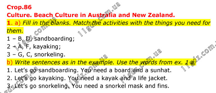 Culture. Beach Culture in Australia and New Zealand. 1. a) Fill in the blanks. Match the activities with the things you need for them. 1 – B, D, sandboarding; 2 – A, F, kayaking; 3 – G, C, snorkeling. b) Write sentences as in the example. Use the words from ex. 1 a. 1. Let’s go sandboarding. You need a board and a sunhat. 2. Let’s go kayaking. You need a kayak and a life jacket. 3. Let’s go snorkeling. You need a snorkel mask and fins.