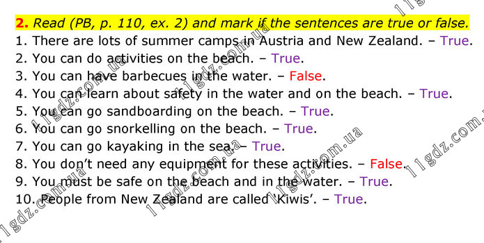 Read (PB, p. 110, ex. 2) and mark if the sentences are true or false. 1. There are lots of summer camps in Austria and New Zealand. – True. 2. You can do activities on the beach. – True. 3. You can have barbecues in the water. – False. 4. You can learn about safety in the water and on the beach. – True. 5. You can go sandboarding on the beach. – True. 6. You can go snorkelling on the beach. – True. 7. You can go kayaking in the sea. – True. 8. You don’t need any equipment for these activities. – False. 9. You must be safe on the beach and in the water. – True. 10. People from New Zealand are called ‘Kiwis’. – True.