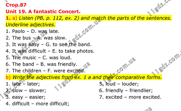 Unit 19. A fantastic Concert. 1. a) Listen (PB, p. 112, ex. 2) and match the parts of the sentences. Underline adjectives. 1. Paolo – D. was late. 2. The bus – A. was slow. 3. It was easy – G. to see the band. 4. It was difficult – E. to take photos. 5. The music – C. was loud. 6. The band – B. was friendly. 7. The children – F. were excited. b) Write the adjectives from ex. 1 a and their comparative forms. 1. late – later; 2. slow – slower; 3. easy – easier; 4. difficult – more difficult; 5. loud – louder; 6. friendly – friendlier; 7. excited – more excited.