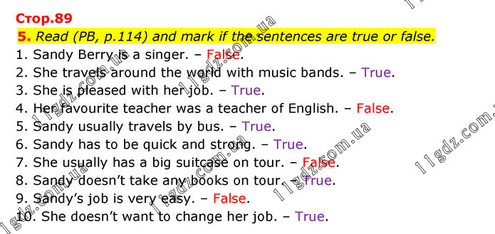 Read (PB, p.114) and mark if the sentences are true or false. 1. Sandy Berry is a singer. – False. 2. She travels around the world with music bands. – True. 3. She is pleased with her job. – True. 4. Her favourite teacher was a teacher of English. – False. 5. Sandy usually travels by bus. – True. 6. Sandy has to be quick and strong. – True. 7. She usually has a big suitcase on tour. – False. 8. Sandy doesn’t take any books on tour. – True. 9. Sandy’s job is very easy. – False. 10. She doesn’t want to change her job. – True.