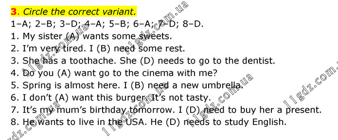 Circle the correct variant. 1–А; 2–B; 3–D; 4–A; 5–B; 6–A; 7–D; 8–D. 1. My sister (A) wants some sweets. 2. I’m very tired. I (B) need some rest. 3. She has a toothache. She (D) needs to go to the dentist. 4. Do you (A) want go to the cinema with me? 5. Spring is almost here. I (B) need a new umbrella. 6. I don’t (A) want this burger. It’s not tasty. 7. It’s my mum’s birthday tomorrow. I (D) need to buy her a present. 8. He wants to live in the USA. He (D) needs to study English.