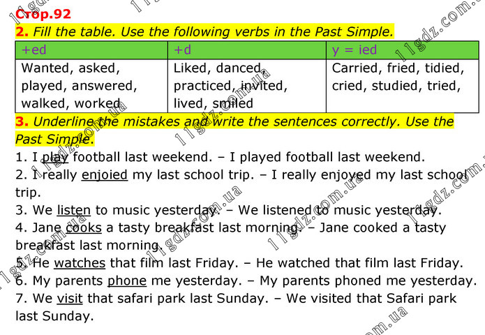 2. Fill the table. Use the following verbs in the Past Simple. +ed +d y = ied Wanted, asked, played, answered, walked, worked Liked, danced, practiced, invited, lived, smiled Carried, fried, tidied, cried, studied, tried, 3. Underline the mistakes and write the sentences correctly. Use the Past Simple. 1. I play football last weekend. – I played football last weekend. 2. I really enjoied my last school trip. – I really enjoyed my last school trip. 3. We listen to music yesterday. – We listened to music yesterday. 4. Jane cooks a tasty breakfast last morning. – Jane cooked a tasty breakfast last morning. 5. He watches that film last Friday. – He watched that film last Friday. 6. My parents phone me yesterday. – My parents phoned me yesterday. 7. We visit that safari park last Sunday. – We visited that Safari park last Sunday.