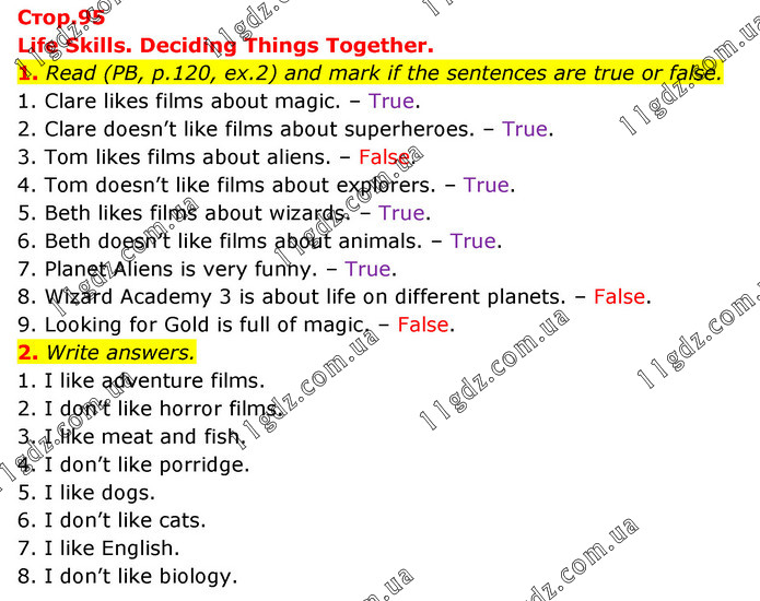 Life Skills. Deciding Things Together. 1. Read (PB, p.120, ex.2) and mark if the sentences are true or false. 1. Clare likes films about magic. – True. 2. Clare doesn’t like films about superheroes. – True. 3. Tom likes films about aliens. – False. 4. Tom doesn’t like films about explorers. – True. 5. Beth likes films about wizards. – True. 6. Beth doesn’t like films about animals. – True. 7. Planet Aliens is very funny. – True. 8. Wizard Academy 3 is about life on different planets. – False. 9. Looking for Gold is full of magic. – False. 2. Write answers. 1. I like adventure films. 2. I don’t like horror films. 3. I like meat and fish. 4. I don’t like porridge. 5. I like dogs. 6. I don’t like cats. 7. I like English. 8. I don’t like biology.