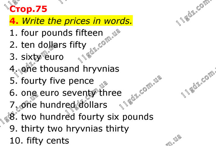 4. Write the prices in words. 1. four pounds fifteen 2. ten dollars fifty 3. sixty euro 4. one thousand hryvnias 5. fourty five pence 6. one euro seventy three 7. one hundred dollars 8. two hundred fourty six pounds 9. thirty two hryvnias thirty 10. fifty cents