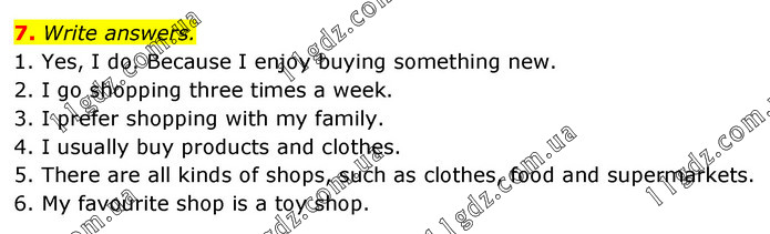 Write answers. 1. Yes, I do. Because I enjoy buying something new. 2. I go shopping three times a week. 3. I prefer shopping with my family. 4. I usually buy products and clothes. 5. There are all kinds of shops, such as clothes, food and supermarkets. 6. My favourite shop is a toy shop.