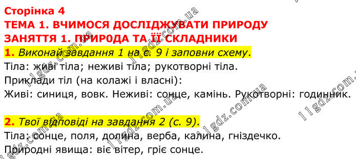 ТЕМА 1. ВЧИМОСЯ ДОСЛІДЖУВАТИ ПРИРОДУ ЗАНЯТТЯ 1. ПРИР0ДА ТА ЇЇ СКЛАДНИКИ 1. Виконай завдання 1 на с. 9 і заповни схему. Тіла: живі тіла; неживі тіла; рукотворні тіла. Приклади тіл (на колажі і власні): Живі: синиця, вовк. Неживі: сонце, камінь. Рукотворні: годинник. Твої відповіді на завдання 2 (с. 9). Тіла: сонце, поля, долина, верба, калина, гніздечко. Природні явища: віє вітер, гріє сонце.