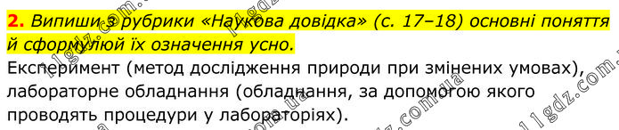2. Випиши з рубрики «Наукова довідка» (с. 17–18) основні поняття й сформулюй їх означення усно. Експеримент (метод дослідження природи при змінених умовах), лабораторне обладнання (обладнання, за допомогою якого проводять процедури у лабораторіях).