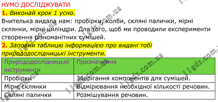 НУМО ДОСЛІДЖУВАТИ 1. Виконай крок 1 усно. Вчителька видала нам: пробірки, колби, скляні палички, мірні склянки, мірні циліндри. Для того, щоб ми проводили експерименти створення різноманітних сумішей. 2. Заповни таблицю інформацією про видані тобі природодослідницькі інструменти.