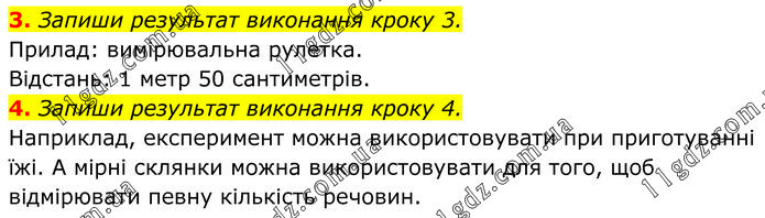 3. Запиши результат виконання кроку 3. Прилад: вимірювальна рулетка. Відстань: 1 метр 50 сантиметрів. 4. Запиши результат виконання кроку 4. Наприклад, експеримент можна використовувати при приготуванні їжі. А мірні склянки можна використовувати для того, щоб відмірювати певну кількість речовин.