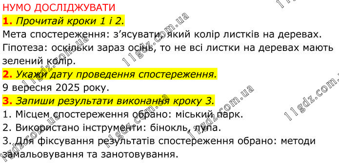 НУМО ДОСЛІДЖУВАТИ 1. Прочитай кроки 1 і 2. Мета спостереження: з’ясувати, який колір листків на деревах. Гіпотеза: оскільки зараз осінь, то не всі листки на деревах мають зелений колір. 2. Укажи дату проведення спостереження. 9 вересня 2025 року. 3. Запиши результати виконання кроку 3. 1. Місцем спостереження обрано: міський парк. 2. Використано інструменти: бінокль, лупа. 3. Для фіксування результатів спостереження обрано: методи замальовування та занотовування.