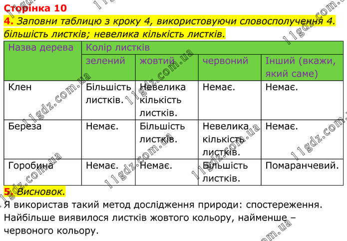 4. Заповни таблицю з кроку 4, використовуючи словосполучення 4. більшість листків; невелика кількість листків. 5. Висновок. Я використав такий метод дослідження природи: спостереження. Найбільше виявилося листків жовтого кольору, найменше – червоного кольору.