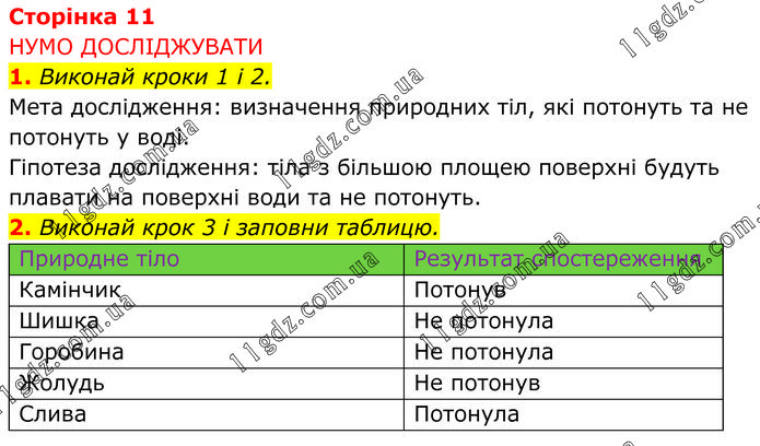 НУМО ДОСЛІДЖУВАТИ 1. Виконай кроки 1 і 2. Мета дослідження: визначення природних тіл, які потонуть та не потонуть у воді. Гіпотеза дослідження: тіла з більшою площею поверхні будуть плавати на поверхні води та не потонуть. 2. Виконай крок 3 і заповни таблицю.