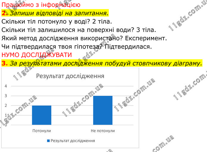 Працюймо з інформацією 2. Запиши відповіді на запитання. Скільки тіл потонуло у воді? 2 тіла. Скільки тіл залишилося на поверхні води? 3 тіла. Який метод дослідження використано? Експеримент. Чи підтвердилася твоя гіпотеза? Підтвердилася. НУМО ДОСЛІДЖУВАТИ 3. За результатами дослідження побудуй стовпчикову діаграму.