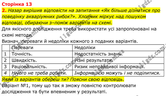 2. Назар вирішив відповісти на запитання «Як більше дізнатися про поведінку акваріумних рибок?». Хлопчик міркує над пошуком відповіді, обираючи з–поміж варіантів на схемі. Для якісного дослідження треба використати усі запропоновані на схемі методи. Визнач, переваги й недоліки кожного з поданих варіантів. Який із варіантів обереш ти? Поясни свою відповідь. Варіант №1, тому що так я зможу повністю контролювати дослідження та бути впевненим у результаті.
