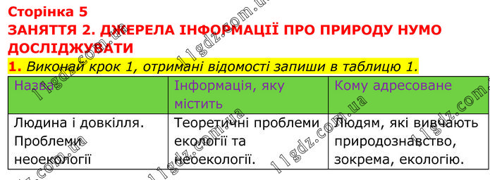 ЗАНЯТТЯ 2. ДЖЕРЕЛА ІНФОРМАЦІЇ ПРО ПРИРОДУ НУМО ДОСЛІДЖУВАТИ 1. Виконай крок 1, отримані відомості запиши в таблицю 1.