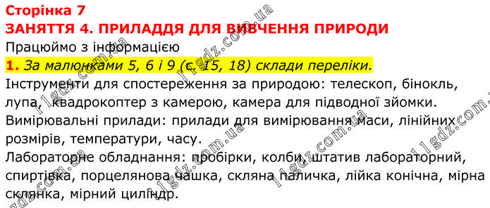 ЗАНЯТТЯ 4. ПРИЛАДДЯ ДЛЯ ВИВЧЕННЯ ПРИРОДИ Працюймо з інформацією 1. За малюнками 5, 6 і 9 (с. 15, 18) склади переліки. Інструменти для спостереження за природою: телескоп, бінокль, лупа, квадрокоптер з камерою, камера для підводної зйомки. Вимірювальні прилади: прилади для вимірювання маси, лінійних розмірів, температури, часу. Лабораторне обладнання: пробірки, колби, штатив лабораторний, спиртівка, порцелянова чашка, скляна паличка, лійка конічна, мірна склянка, мірний циліндр.