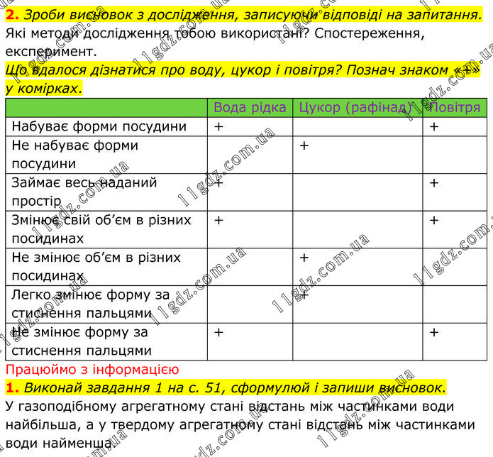 2. Зроби висновок з дослідження, записуючи відповіді на запитання. Які методи дослідження тобою використані? Спостереження, експеримент. Що вдалося дізнатися про воду, цукор і повітря? Познач знаком «+» у комірках. Працюймо з інформацією 1. Виконай завдання 1 на с. 51, сформулюй і запиши висновок. У газоподібному агрегатному стані відстань між частинками води найбільша, а у твердому агрегатному стані відстань між частинками води найменша.