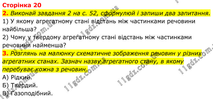 2. Виконай завдання 2 на с. 52, сформулюй і запиши два запитання. 1) У якому агрегатному стані відстань між частинками речовини найбільша? 2) Чому у твердому агрегатному стані відстань між частинками речовини найменша? 3. Розглянь на малюнку схематичне зображення речовин у різних агрегатних станах. Зазнач назву агрегатного стану, в якому перебуває кожна з речовин. А) Рідкий. Б) Твердий. В) Газоподібний.
