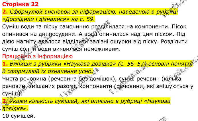 2. Сформулюй висновок за інформацією, наведеною в рубриці «Дослідили і дізналися» на с. 59. Суміш води та піску самочинно розділилася на компоненти. Пісок опинився на дні посудини. А вода опинилася над цим піском. Під дією магніту вдалося відділити залізні ошурки від піску. Розділити суміш солі й води виявилося неможливим. Працюймо з інформацією 1. Випиши з рубрики «Наукова довідка» (с. 56–57) основні поняття й сформулюй їх означення усно. Чиста речовина (речовина без домішок), суміш речовин (кілька речовин, змішаних разом), компоненти (речовини, які змішуються у суміш). 2. Укажи кількість сумішей, які описано в рубриці «Наукова довідка». 10 сумішей.