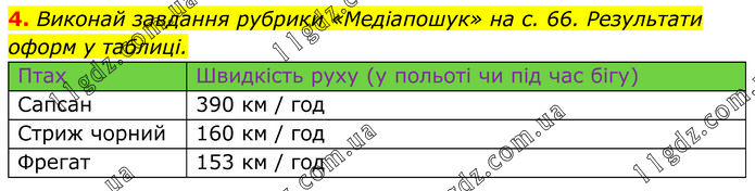 Виконай завдання рубрики «Медіапошук» на с. 66. Результати оформ у таблиці.