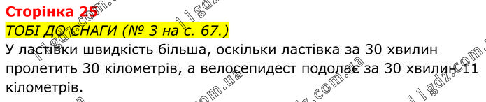 ТОБІ ДО СНАГИ (№ 3 на с. 67.) У ластівки швидкість більша, оскільки ластівка за 30 хвилин пролетить 30 кілометрів, а велосепидест подолає за 30 хвилин 11 кілометрів.