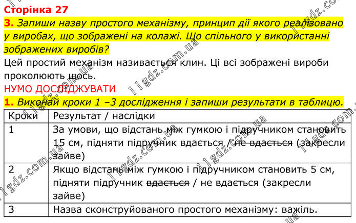 Запиши назву простого механізму, принцип дії якого реалізовано у виробах, що зображені на колажі. Що спільного у використанні зображених виробів? Цей простий механізм називається клин. Ці всі зображені вироби проколюють щось. НУМО ДОСЛІДЖУВАТИ 1. Виконай кроки 1 –3 дослідження і запиши результати в таблицю.