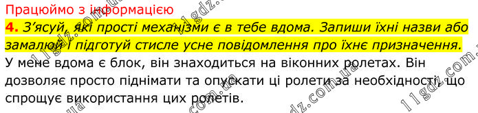 Працюймо з інформацією 4. З’ясуй, які прості механізми є в тебе вдома. Запиши їхні назви або замалюй і підготуй стисле усне повідомлення про їхнє призначення. У мене вдома є блок, він знаходиться на віконних ролетах. Він дозволяє просто піднімати та опускати ці ролети за необхідності, що спрощує використання цих ролетів.